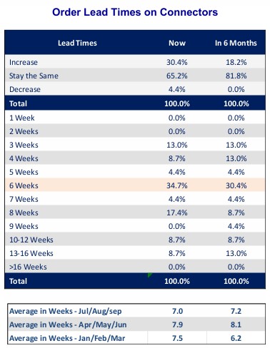 Industry personnel were asked, “In your opinion, is lead time increasing, staying the same, or decreasing now and in 6 months from now?” The following table provides the survey results, including distribution of responses: